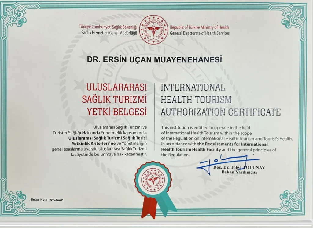 Tesisimiz, Uluslararası Sağlık Turizmi ve Turistin Sağlığı Hakkında Yönetmelik kapsamında, Uluslararası Sağlık Turizmi Sağlık Tesisi Yetkinlik Kriterleri’ne ve Yönetmeliğin genel esaslarına uyarak, Uluslararası Sağlık Turizmi faaliyetinde bulunmaya hak kazanmıştır.